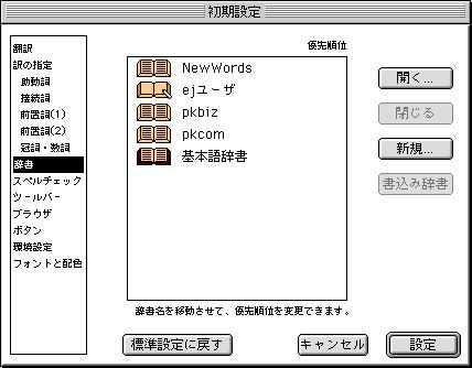 以上の各辞書は、ツールバーの「設定」をクリックして「辞書」をクリックすると表れるダイヤログで使用する辞書を選択したり、優先順位の指定ができる。設定済みのダイヤログの例を図1(設定済みのダイヤログの例)に示す。