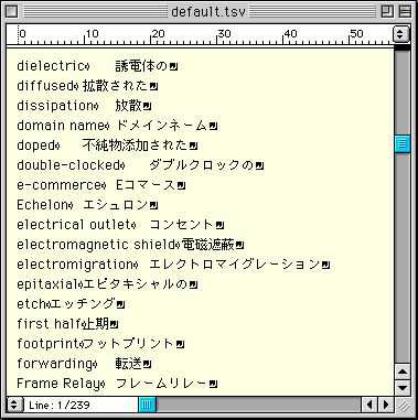 ここで開くウインドウは「メッセージウインドウ」であってエディタでないので、書き込みはできない。辞書ユーテリティでユーザー辞書をTSVフォーマットのテキストソースに変換したファイルを別のエディタで開いた例を図3(別のエディタでファイルを開いた例)に示す。