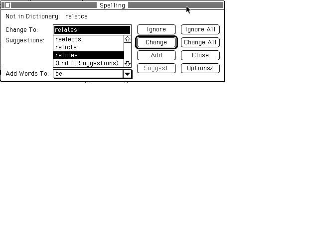 MS-WORDの<Tools>メニューの<Spelling>でスペルチェックにかけると、主にOCRの誤認識によるエラーが表示され、置き換えの候補が数点提示される。適当なものを選んで、<Replace>をクリックする(図9スペルチェック)。