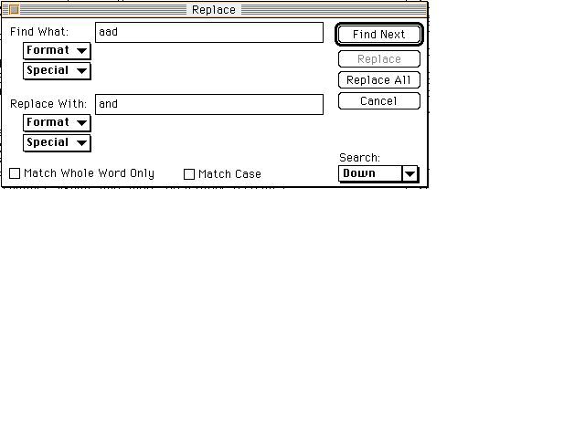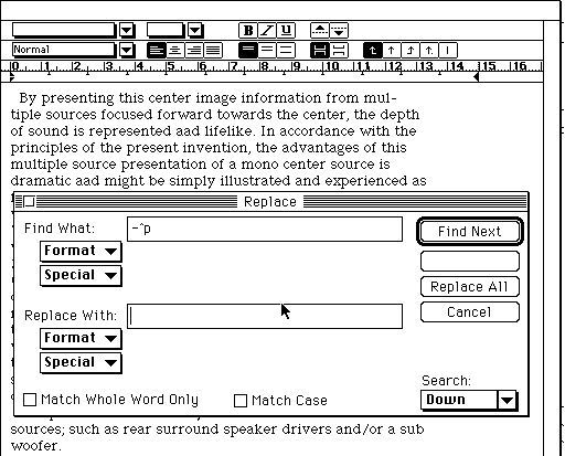 MS-Wordの<Edit>の<Replace>メニューで図7 ハイフォネーションの処理のようにハイフン(-)の後に続く改行コード(^p)をスペースなしに置き換えるように設定して<Replace