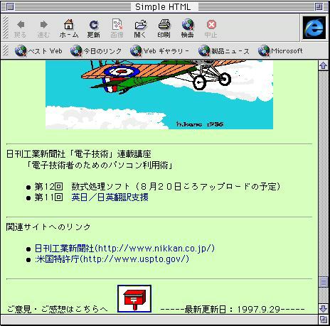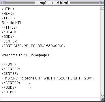 とすれば320ピクセルX180ピクセルの大きさのbiplane.GIFというGIF形式の画像ファイルが表示される。文字と同じように画面の中央に表示したい時はタグ<CENTER>と</CENTER>で囲んでおく(図5)。これで文字と画像の表示がされ、それらしくなった(図6)。
