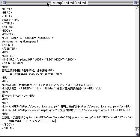 もっとも原始的な方法だが、簡単なHTMLファイルであればMacならSimpleText、Win95ならメモ帳などのテキストエディタでタグを入力して作成できる。