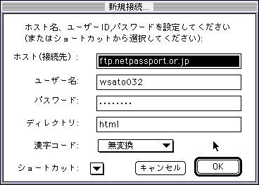 次に「FetchーJ」を立ち上げるとウインドウが表示されるので、ホスト名、ユーザーID、