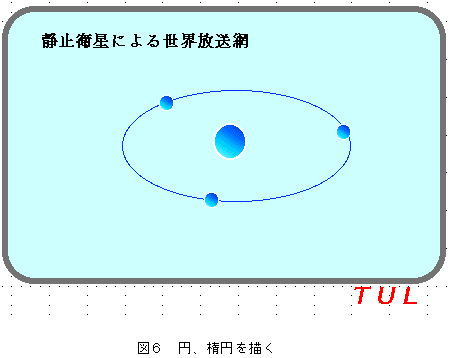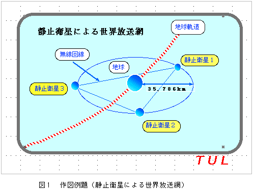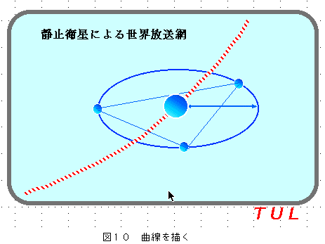 アーサー・C・クラークの提唱した三機の静止衛星による世界放送網の構想(図1)を作図例題として、統合ソフト「クラリスワークス」のドロー環境の使い方について学習する。
