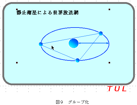次に<配置>メニューで<グループ化>を選ぶとハンドルは4隅だけとなる(図9)。