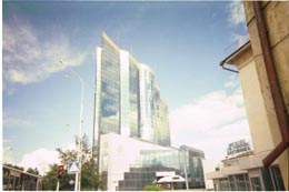 市街でひときわ目立つウランバートル銀行。街路樹のハコヤナギの白い綿毛が雪のように舞っていた。