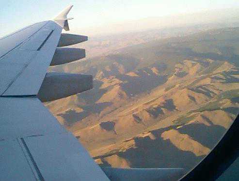 飛行機がゴビ上空にさしかかった頃、モニターに映し出される飛行機の向きが西に向かっているのに気が付いた。たしかに進行方向から西日が射している。このままではキルギスに行ってしまうと不安になる。しばらくして「ウランバートルは強風のため空港が閉鎖されております。ただいまから北京空港に向かい臨時着陸いたします」とアナウンスがあった。おかげで上空から万里の長城を見ることができたが、少々涼しい思いをした。(2000/06/08)