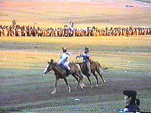 ナーダムの競馬第3レースは夕日が沈む頃、ゴール前の競り合いにひときわ高い歓声が茜色の草原にこだまする。
